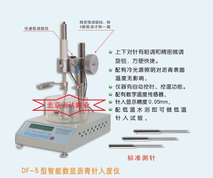 DF-5瀝青針入度測(cè)定儀是根據(jù)中華人民共和國(guó)行業(yè)標(biāo)準(zhǔn)JTG E20-2011《公路工程瀝青及瀝青混合料試驗(yàn)規(guī)程》中的T0604-2011《瀝青針入度試驗(yàn)》所規(guī)定的要求設(shè)計(jì)制造的,適用于測(cè)定道路石油瀝青、改性瀝青針入度以及液體石油瀝青或乳化瀝青蒸發(fā)后殘留物的針入度。使用簡(jiǎn)單、方便、無需預(yù)熱,為我國(guó)公路、市政、建筑、石油等領(lǐng)域提供了一種高精度的先進(jìn)儀器。